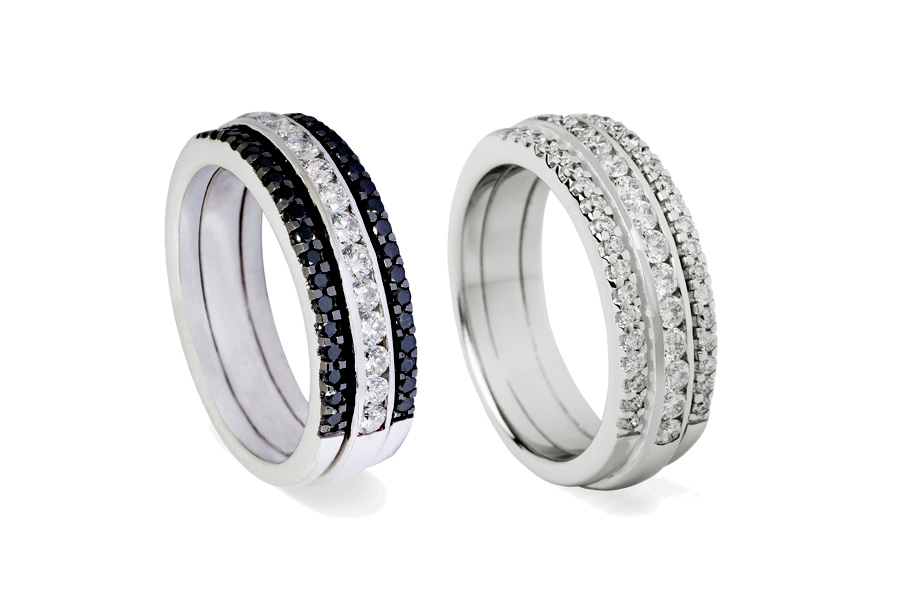 Anillos de Oro Blanco compuestos por una fila central de brillantes engastados en carril y brillantes engastados en grano a los lados.