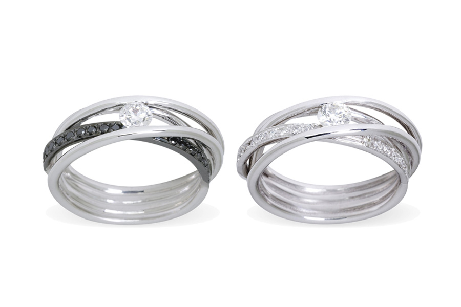 Anillos de Oro Blanco compuestos por cuatro hilos, dos alturas, un brillante engastado al aire y brillantes en grano.