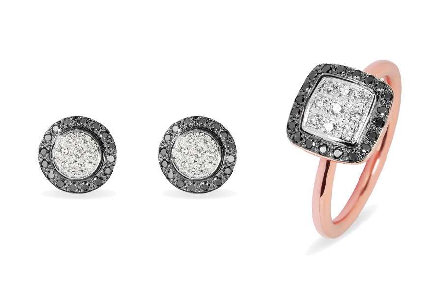 Conjunto de anillo y pendientes de Oro Rosa y Oro Blanco combinando diamantes blancos y negros.