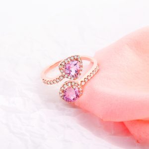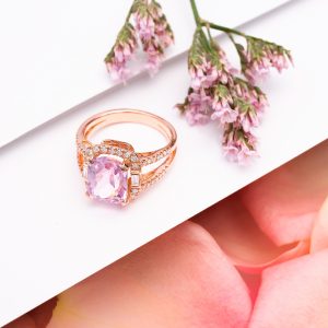 Anillo de oro rosa de 1ª Ley, diamantes y kuncita.