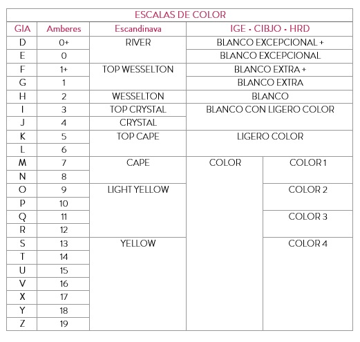 Existen cuatro escalas de colores para designar los grados de color del diamante: GIA (Gemological Institute of America), Comité de Nomenclatura Escandinava, IDC-HRD (International Diamond Council) y CIBJO (Confederación Internacional de Orfebres y Joyeros). La escala de colores más común del diamante es la escala GIA que va desde la D que es el blanco excepcional hasta la Z que corresponde al amarillo. De esta manera, podemos determinar los grados de color de un diamante tallado.
