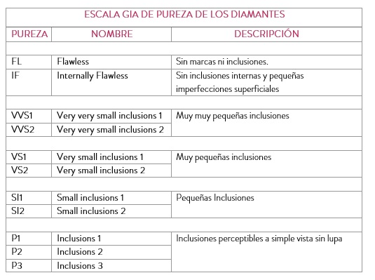 Los valores de la escala de pureza determinan la ausencia de inclusiones o defectos. Por un lado, las inclusiones pueden ser internas o externas, cuantas menos inclusiones tenga un diamante más luz podrá atravesarlo y será de mayor calidad. Por otro lado, los defectos normalmente se producen durante la manipulación de la piedra, ya sea durante el corte o el tallado de la piedra o durante el pulido.