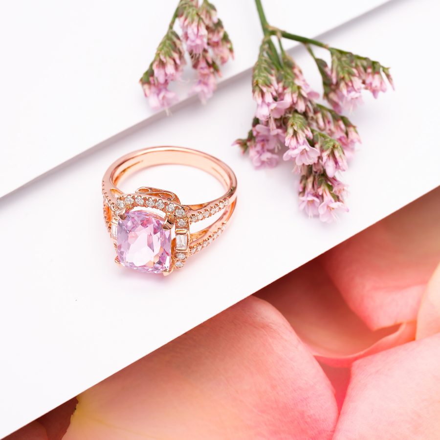 Anillo de oro rosa de 1ª Ley con una kuncita central talla cushion de aproximadamente 3,88 ct, rodeada por diamantes talla brillante (0,32 ct) y diamantes talla baguette (0,09 ct).