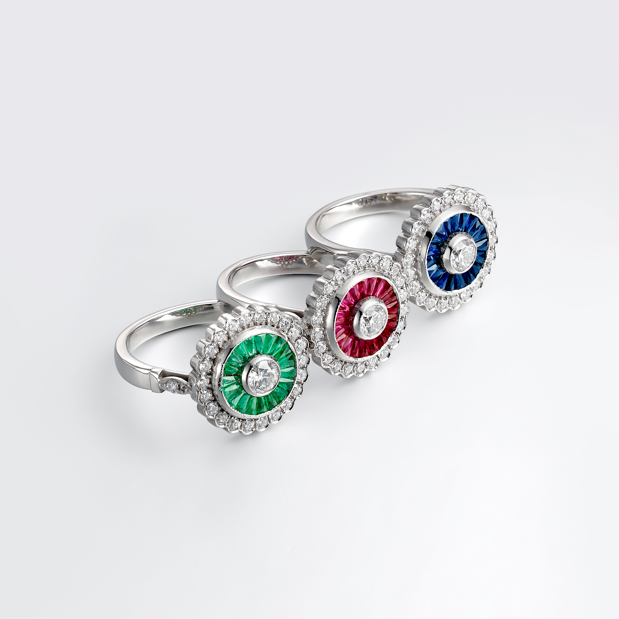 Anillo ojo de perdiz en oro blanco de 1ª Ley con diseño art-decó compuesto por un diamante central de 0,20 ct rodeado por rosetón de esmeraldas calibradas (0,47 ct aproximado) y diamantes (0,30 ct).