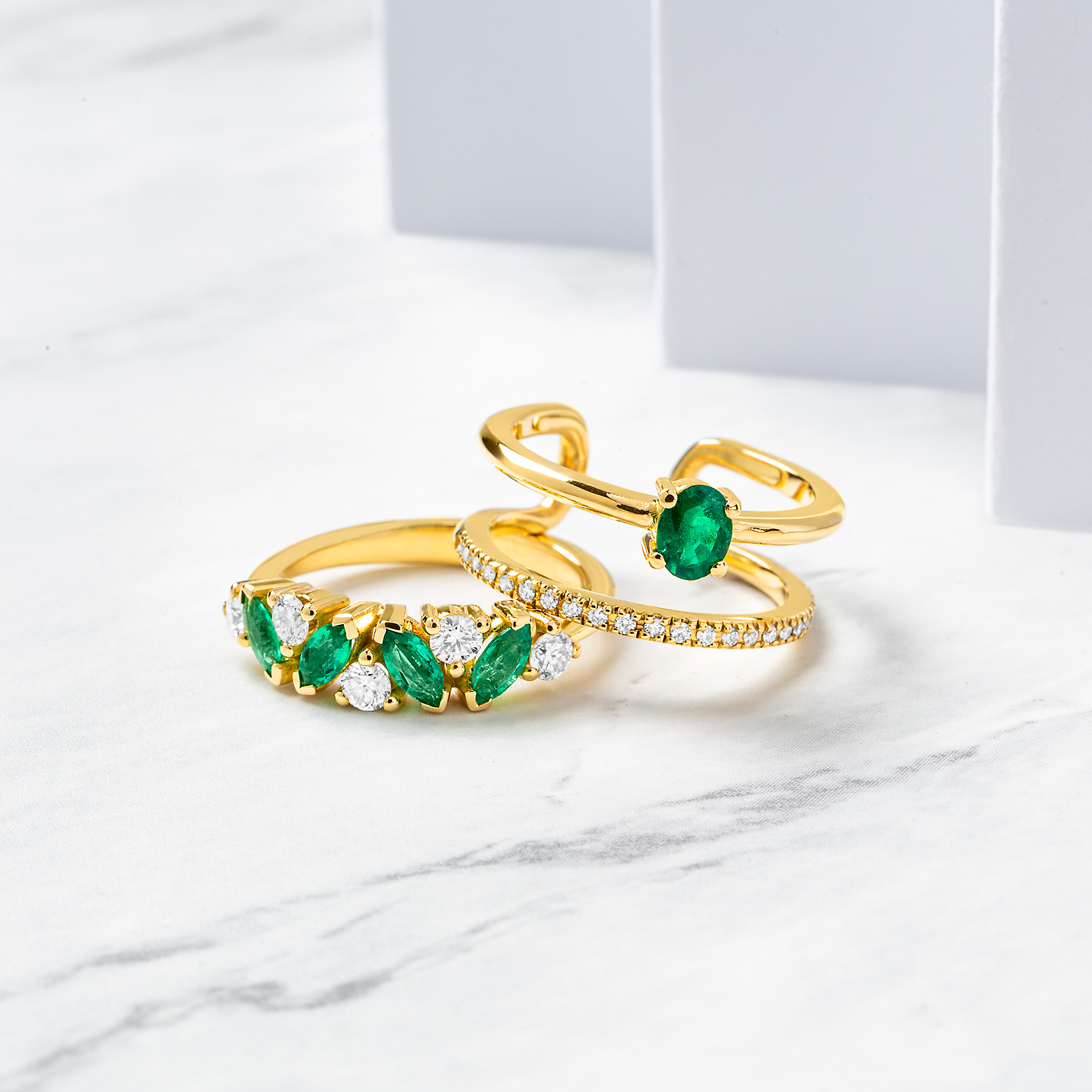 Anillo doble de oro amarillo de 1ª Ley de 18 quilates compuesto por una esmeralda talla oval (0,32 ct aproximado) y diamantes talla brillante (0,12 ct).