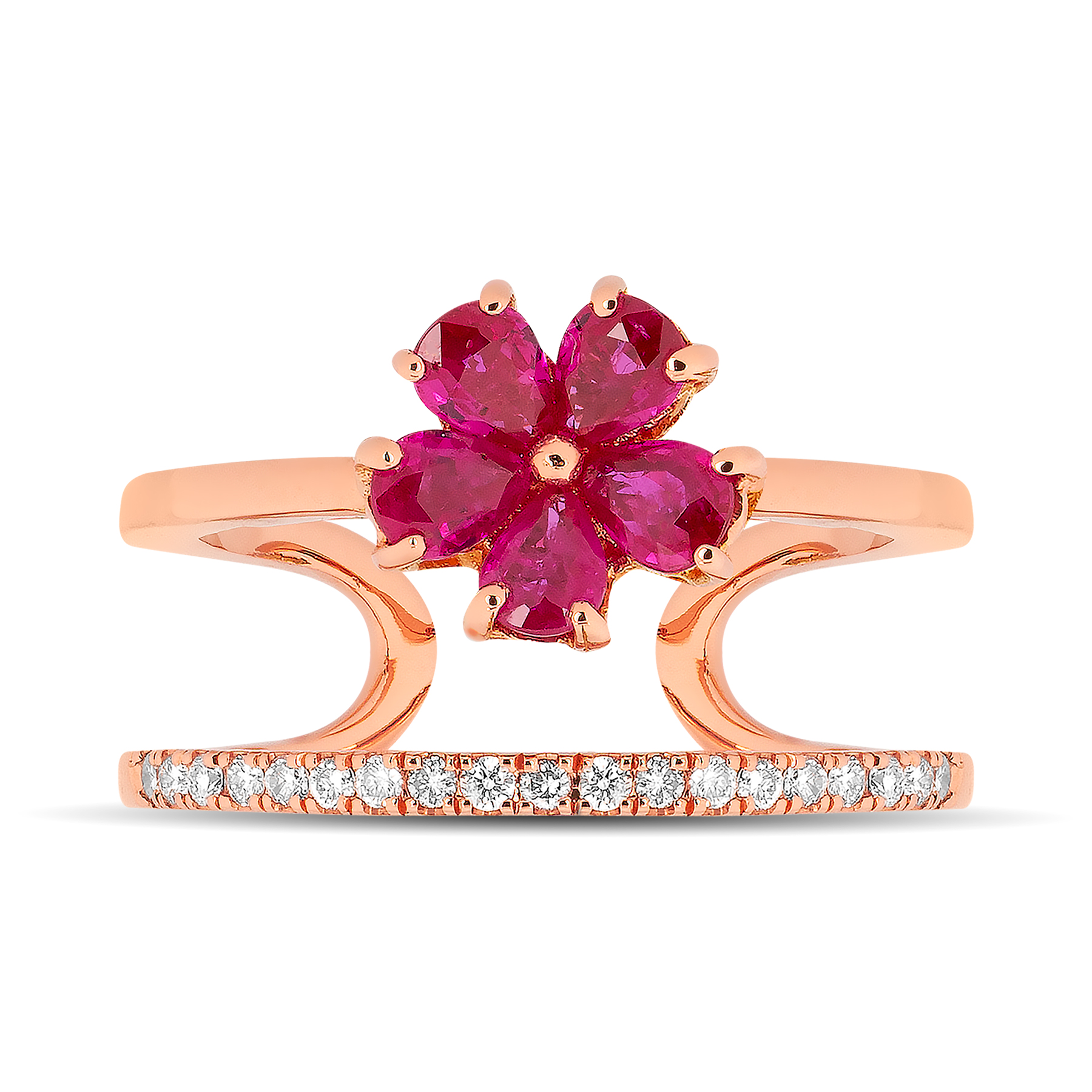Anillo doble de oro rosa de 1ª Ley de 18 quilates compuesto por flor de rubíes talla pera (0,82 ct aproximado) y diamantes talla brillante (0,15 ct).