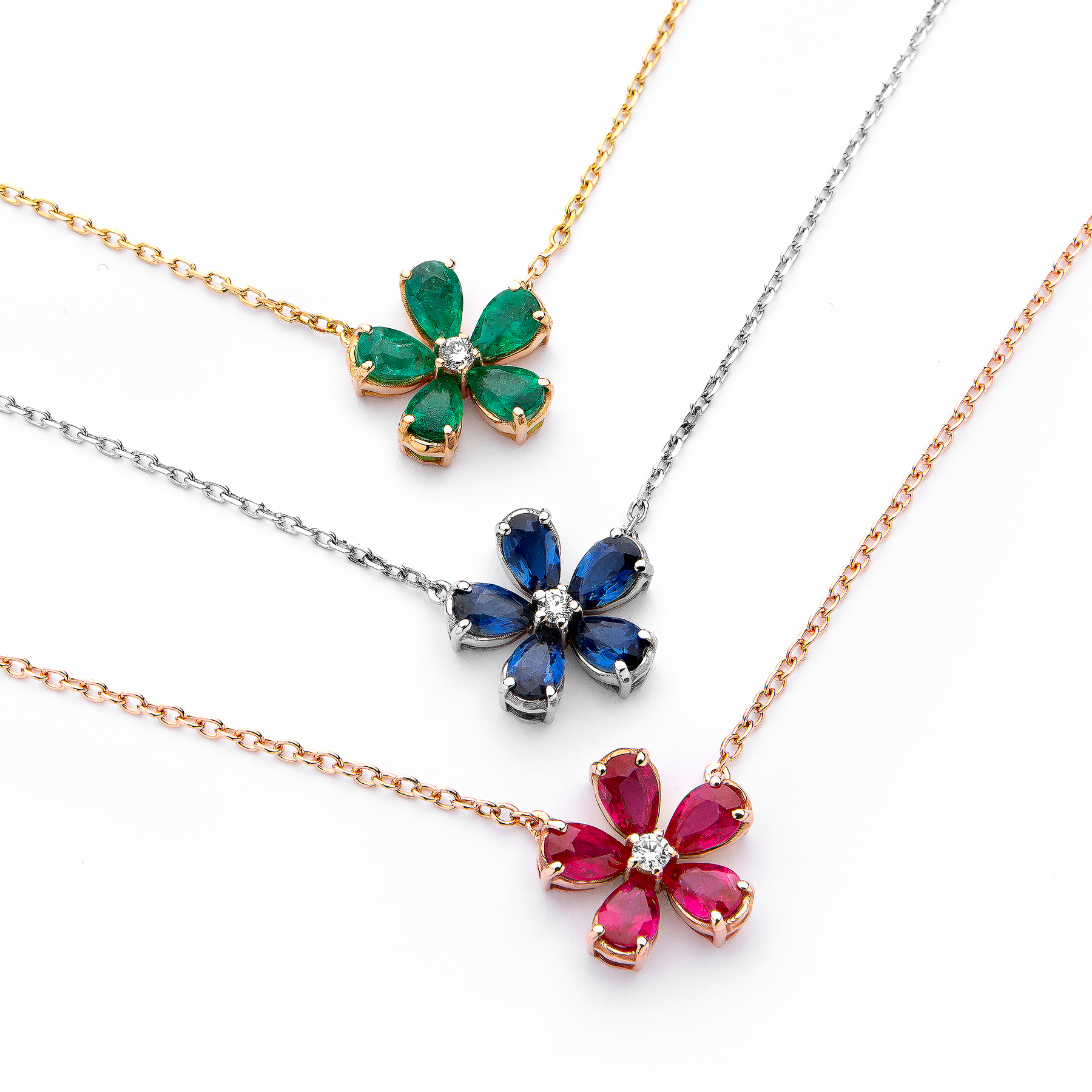 Collar de oro amarillo de 1ª Ley compuesto por una flor de esmeraldas talla pera (0,91 ct aproximado) y un diamante en el centro (0,03 ct).