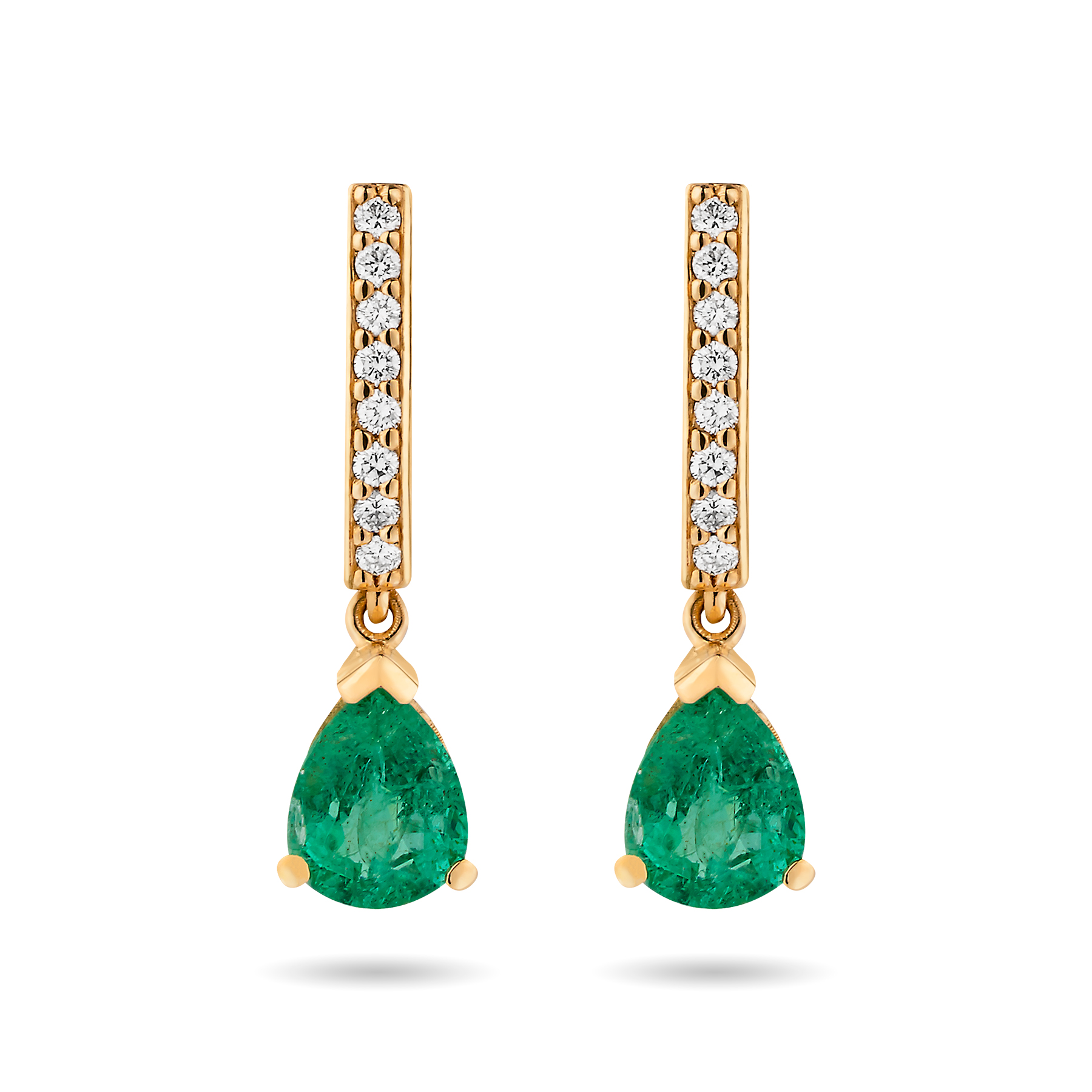 Pendientes de oro amarillo, diamantes y esmeraldas talla pera