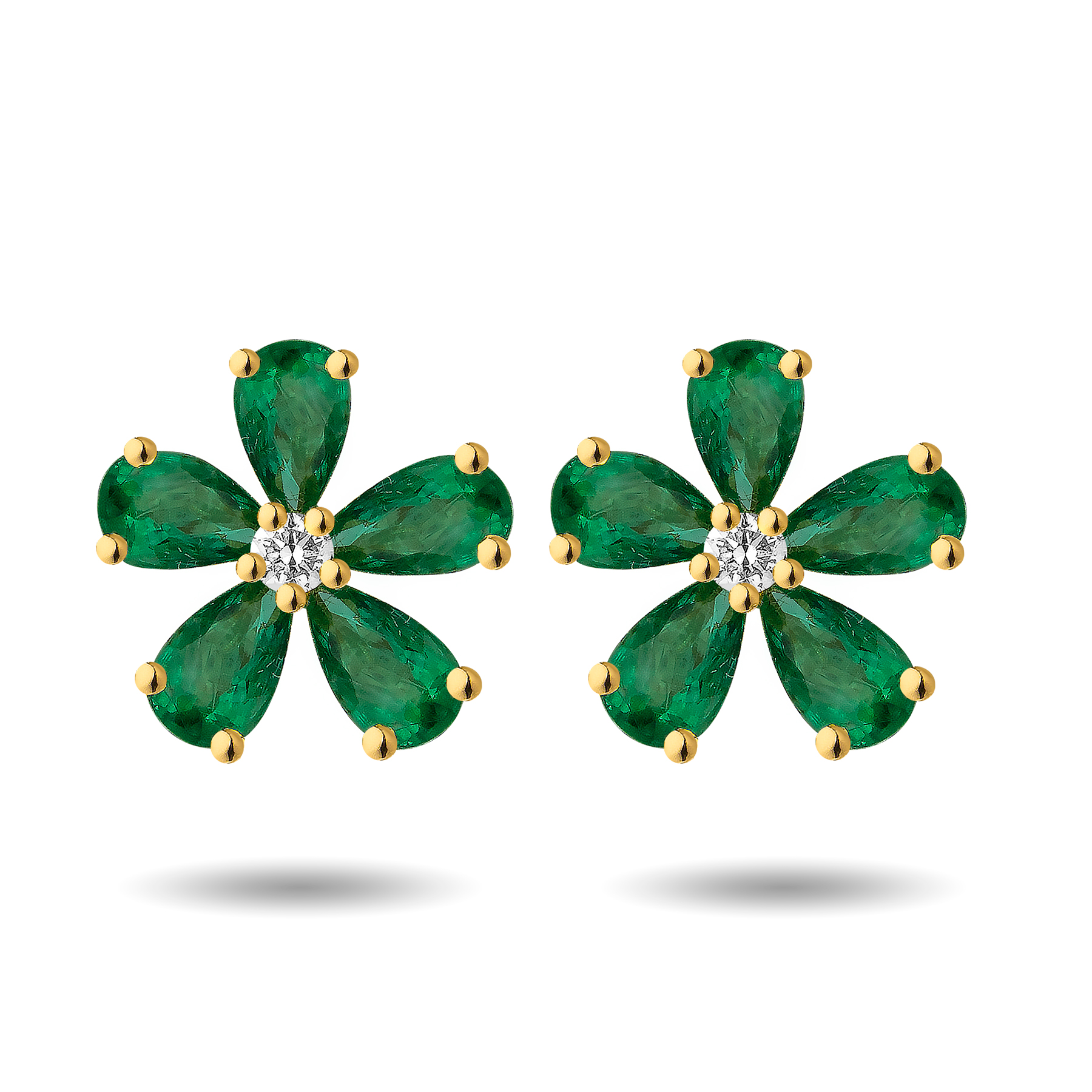 Pendientes de oro amarillo de 1ª Ley compuestos por una flor de esmeraldas talla pera (1,64 ct aproximado) y un diamante en el centro (0,06 ct).