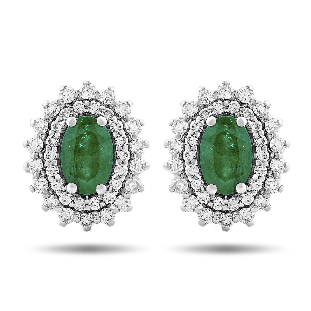Pendientes en oro blanco de 1ª Ley con esmeraldas talla oval (0,75 ct aproximado) y doble orla de diamantes alrededor (0,48 ct).