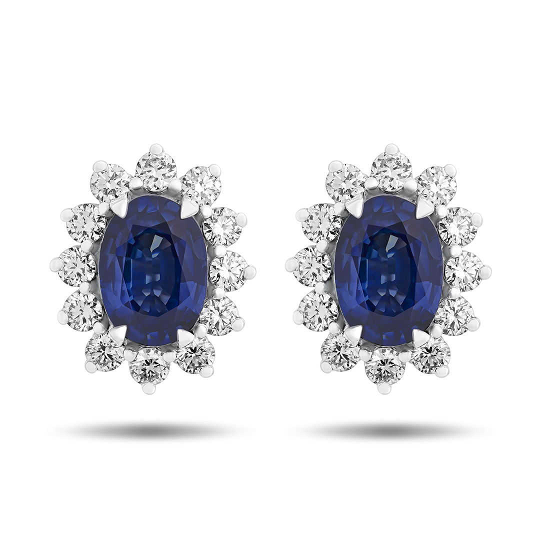 Pendientes en oro blanco de 1ª Ley con zafiros talla oval (peso aproximado de 2,04 ct), rodeados de diamantes talla brillante (0,60 ct).
