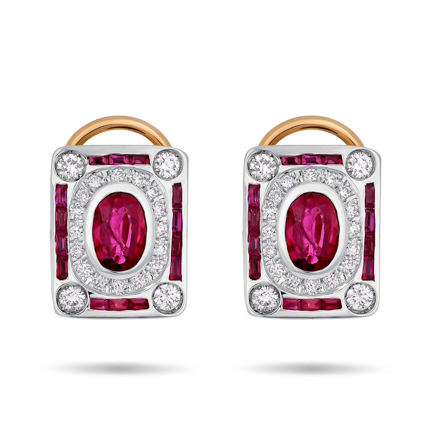 Pendientes bicolor de oro blanco y amarillo de 1ª Ley compuesto por rubíes talla oval, rubies retallados (0,76 ct aproximado) y diamantes (0,38 ct).