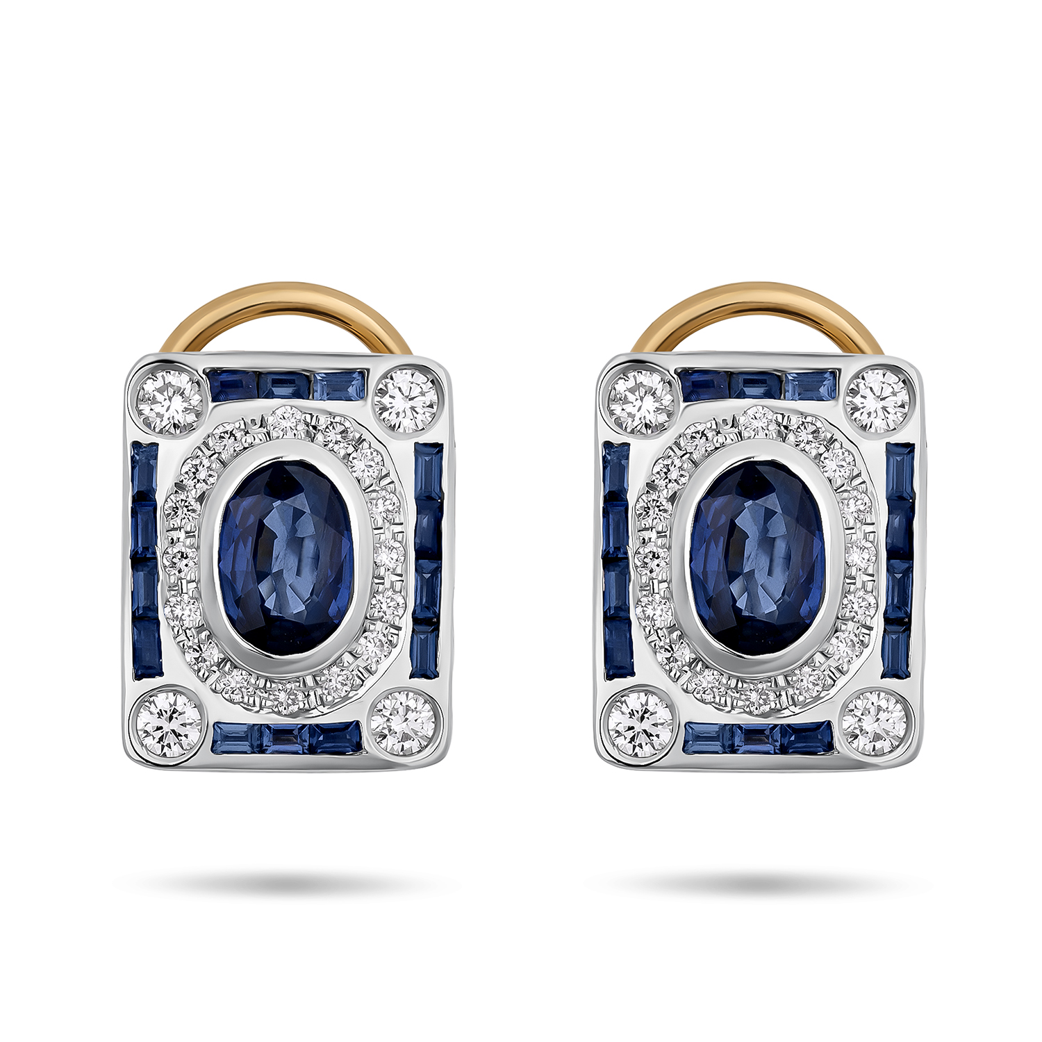 Pendientes bicolor de oro blanco y amarillo de 1ª Ley compuestos por zafiros talla oval, zafiros retallados (0,99 ct aproximado) y diamantes (0,38 ct).